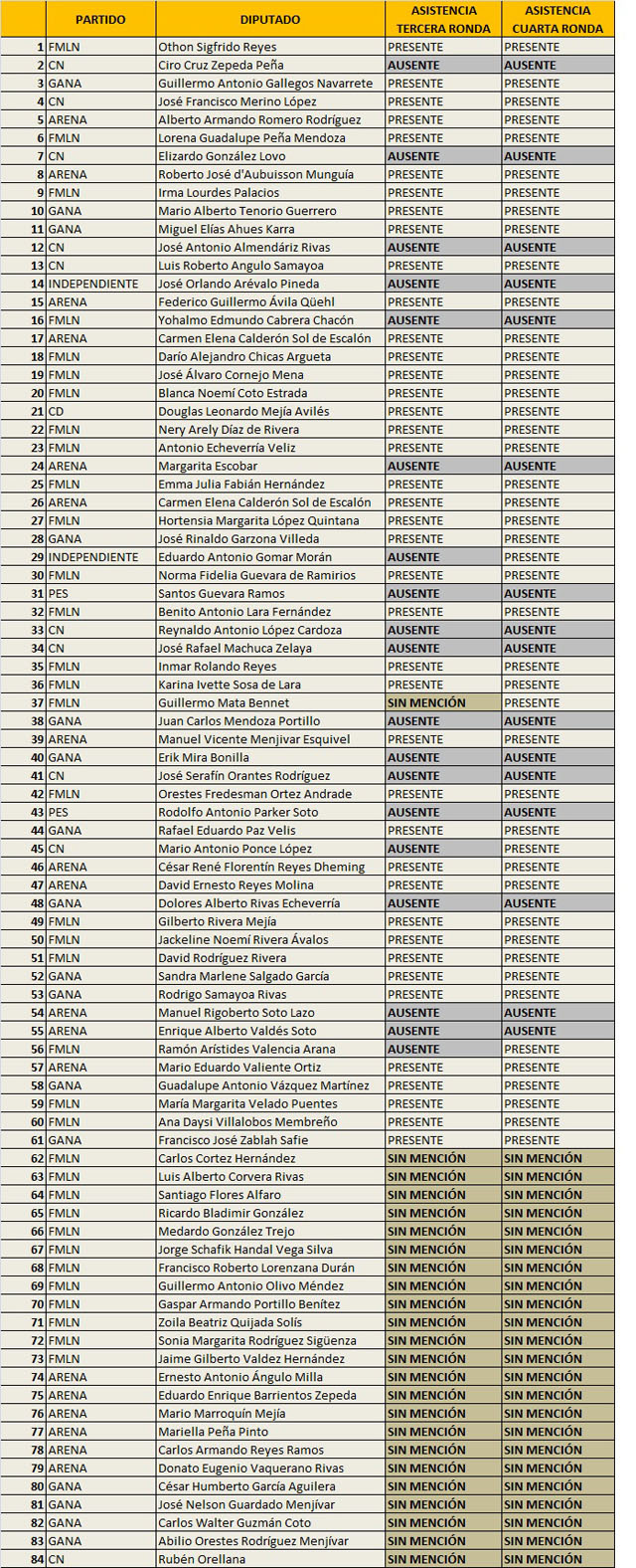 Entre los 60 nombres que sí leyó Palacios, los ausentes fueron 19: siete de Concertación Nacional (de un total de 10 mencionados), el independiente Eduardo Gomar, de Ahuachapán; Orlando Arévalo, del PP; dos de 22 mencionados del FMLN, tres de 13 mencionados de Arena, los dos del Pes y dos de 12 mencionados de Gana. Al final de este texto puede ver la lista completa de los ausentes en el tercer intento de iniciar la sesión y quiénes no fueron mencionados por Palacios al tomar la asistencia.