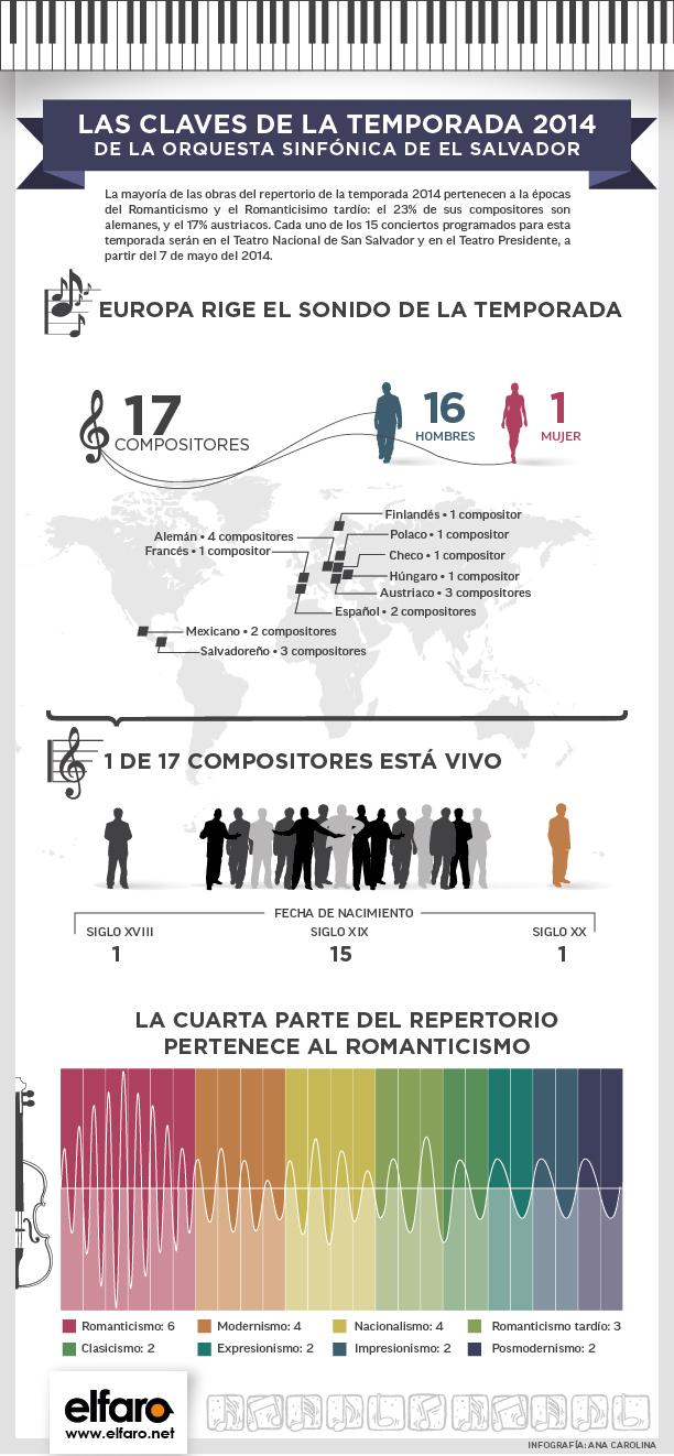 Desde el 3 de enero hasta lo que va de abril, excepto por la Semana Santa, la orquesta ha estado ensayando repertorios de conciertos especiales y de los conciertos de la temporada de este año. Hacen una especie de rito sonoro que empieza con la afinación de los instrumentos, y sigue con la lectura e interpretación colectiva de las obras. Durante la otra mitad del día los ejercicios de entonación corren por cuenta de cada uno, que debe irse a estudiar a su casa y trabajar con su instrumento para lograr una buena ejecución de la pieza. Con este y los próximos siete ensayos, la Orquesta Sinfónica de El Salvador espera tener lo más pulida posible la sinfonía para interpretarla en el concierto de inicio de la temporada 2014 este martes 7 de mayo, en el Teatro Presidente de San Salvador.