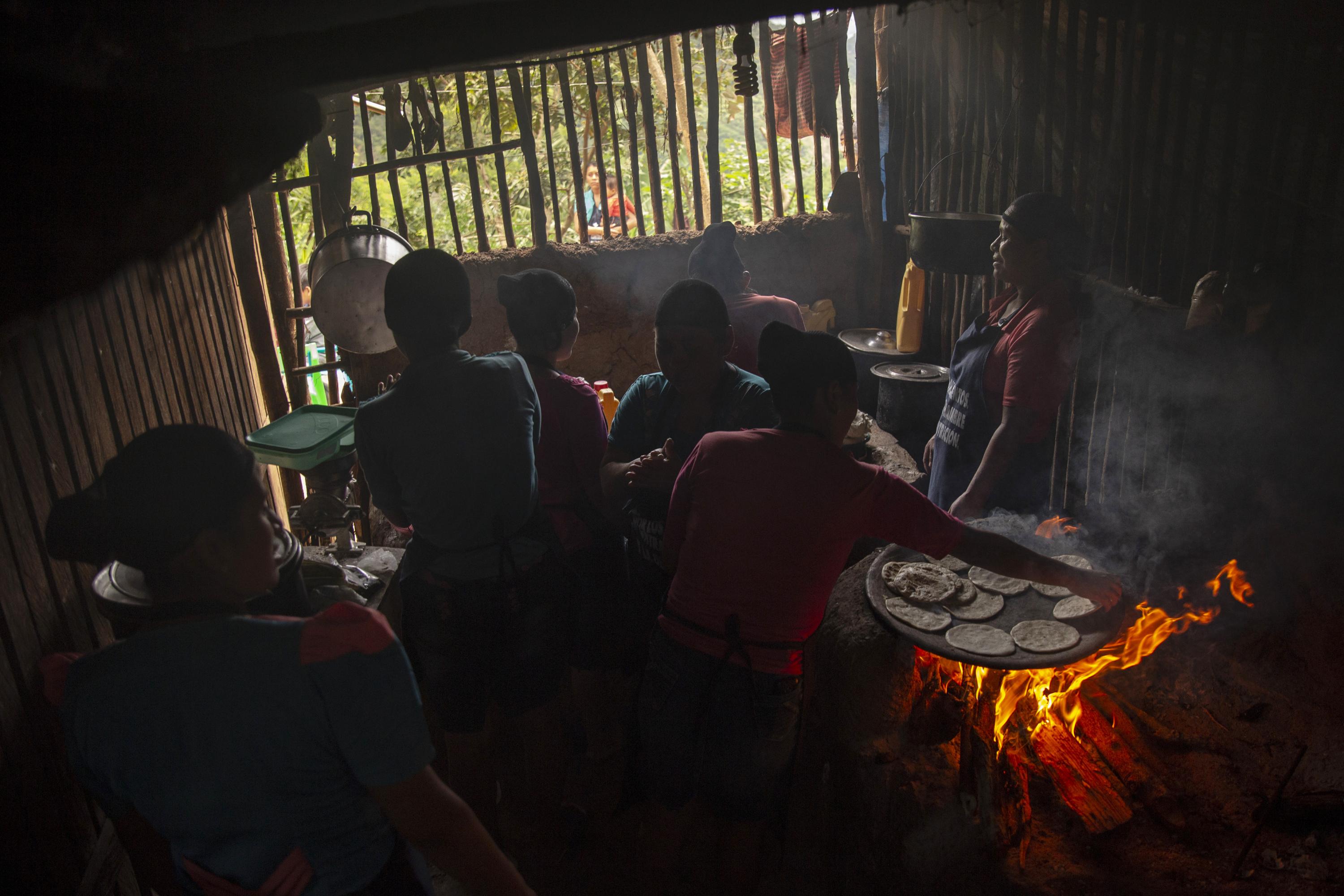 Seven women prepare food for more than 25 children in the home of Vitalina Morales, one of those who takes part in the community kitchen. The women involved in the communal garden project divy up work aimed at improving their children's lives. The two gardens require the work of 50 people, 40 of them women, and the participants have also constructed a clinic and expanded a classroom that no longer had room for more children.