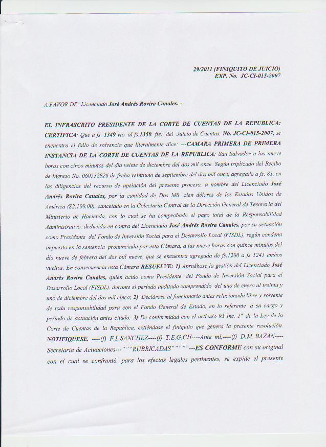 La colecturía del Ministerio de Hacienda reporta que pagó la multa casi dos meses después de asumir el cargo, el 21 de septiembre de 2011 y, tres meses más tarde, el también cuestionado presidente de la Corte de Cuentas, Marcos Gregorio Sánchez Trejo, le entregaba el finiquito. 'Declárase al funcionario antes relacionado libre y solvente de toda responsabilidad para con el fondo General del Estado, en lo referente a su cargo y período de actuación antes citado', reza un documento del 20 de diciembre de 2011. Un finiquito es el documento que aprueba la gestión de un funcionario y Rovira Canales ya lo tiene.