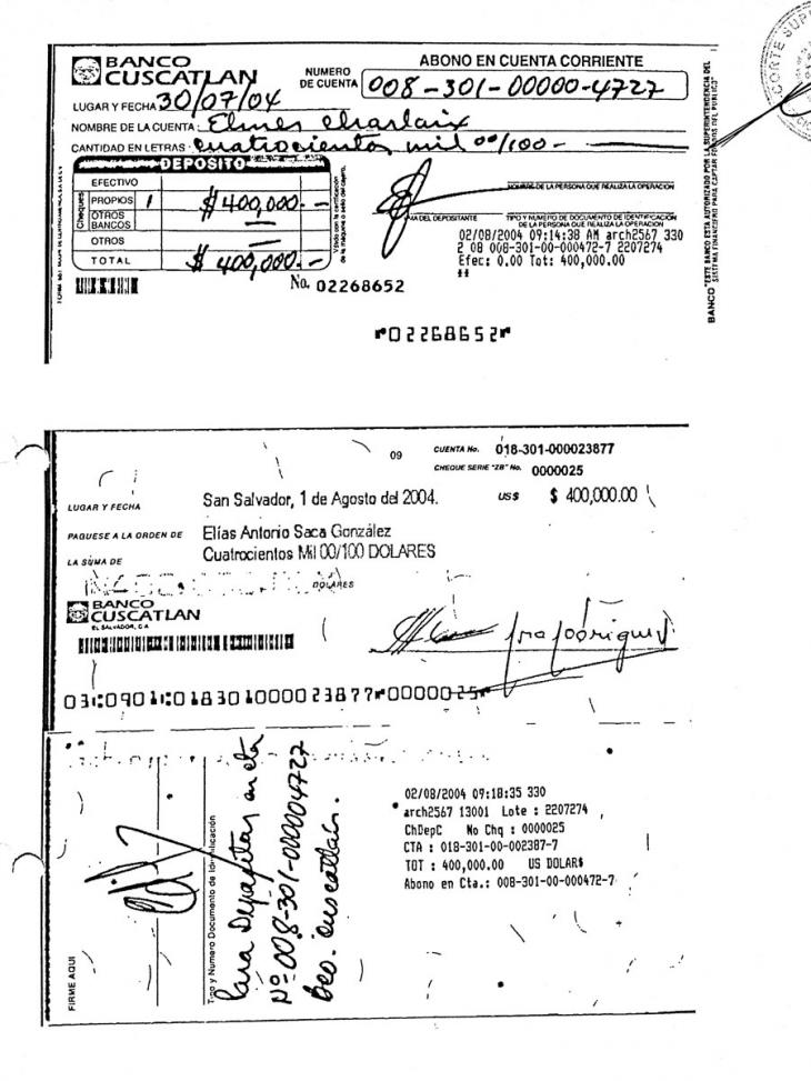 En cuanto al cobro en efectivo de los 116 millones de dólares desde la cuenta de Casa Presidencial, la Fiscalía lo divide en dos etapas. La primera etapa se dio cuando el dinero salía en forma de cheques para ser depositados en dos cuentas de Charlaix. Estas cuentas, dice la Fiscalía, solo estuvieron vigentes durante 10 meses entre la toma de posesión de Saca, en junio de 2004, hasta abril de 2005. De ahí se cobraba el dinero en efectivo.