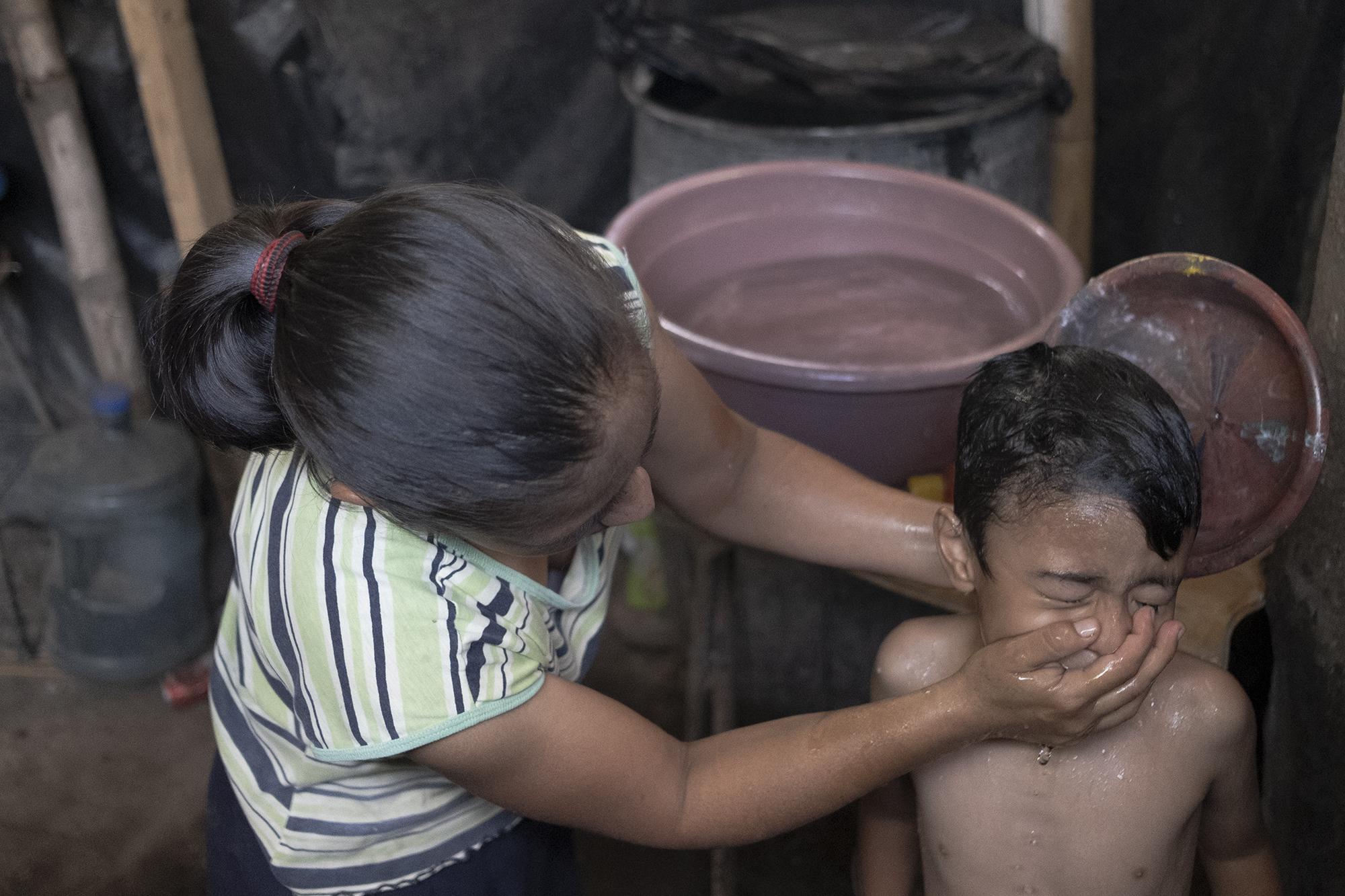 Raquel Flores, de 41 años, da un baño a su hijo Gabriel, de 5. Aquí no hay agua en las casas, deben acarrearla todos los días desde chorros comunitarios. Raquel no cuenta con un trabajo formal. Antes de la cuarentena hacia trabajo de costurera para los vigilantes del Sistema de Integración Centroamericano, pero en su mayoría ya no llegan a laborar. En la casa de Raquel nadie salió beneficiado con el bono de $300. 'Para este día, yo solo cuento con un dólar en mi bolsa. Hoy en la mañana unos vecinos nos regalaron unas pupusas para poder comer, pero para el resto del día no se como voy a hacer, estoy muy preocupada por la alimentación de mi hijo', dijo.