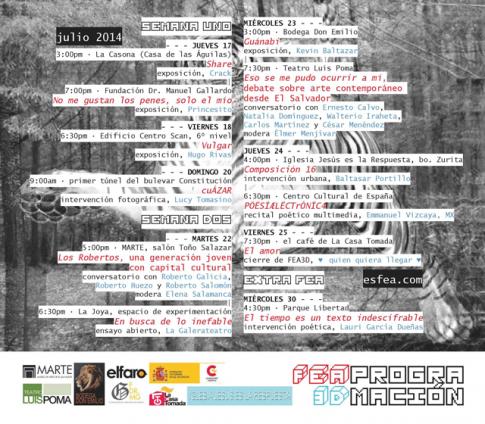 El programa del FEA 2014 incluye muestras y propuestas de arte individual y colectivo en diversos formatos como el performance, instalaciones artísticas en el espacio público, exposiciones de pintura, fotografía, dibujo, escultura, video, también teatro y poesía. Habrá dos conversatorios, uno llamado 'Los Robertos: retrato de una generación joven con capital cultural', con Roberto Huezo, Roberto Salomón y Roberto Galicia, van a hablar de cómo ellos llevaron instituciones culturales antes de cumplir 30 años, esa época que Ricardo Lindo llama la 'efebocracia' de Walter Béneke. Otro será 'Eso se me pudo ocurrir a mí, o no: Debate inédito sobre arte contemporáneo desde El Salvador', para exponer y debatir precisamente sobre el sentido y legitimidad del tipo de expresiones artísticas que ofrece FEA.